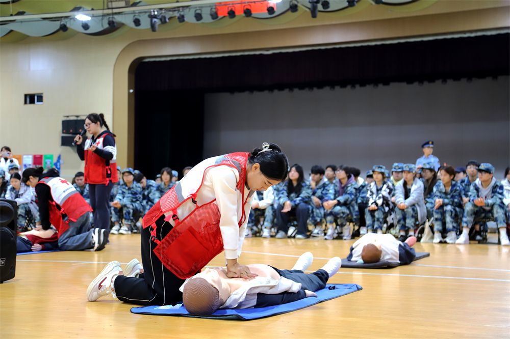 9月22日,校体育馆内气氛热烈。“迷彩砺志,急救练能”新生军训急救实训活...