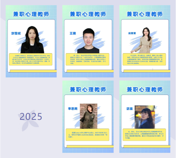 生活中总有一些事,翻遍了通讯录也不知道说予谁听,总有一些时刻,不知如何安放慌乱的情绪,总有一些困扰,难以跟身边的人交流,你知道吗?学校有一群人在默默守护着大家。就是我们学校心理中心,这里有一群可爱温暖的人,愿意在你需要的时刻陪伴你度过那些艰难的时刻。除了专职心理咨询师的守护陪伴外,兼职心理咨询师也来啦!今天,就带大家一起来认识一下我们的兼职心理咨询师们吧!