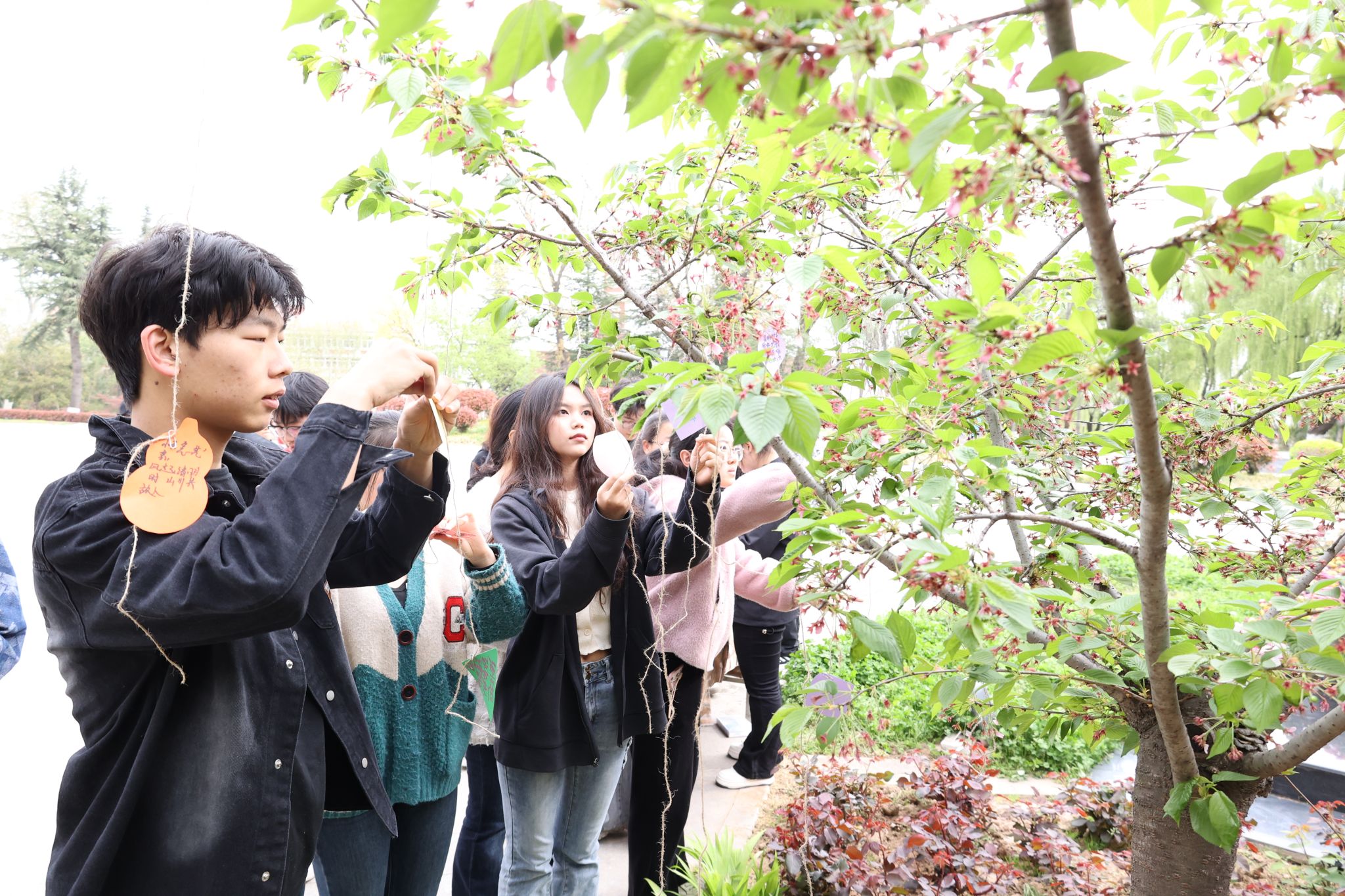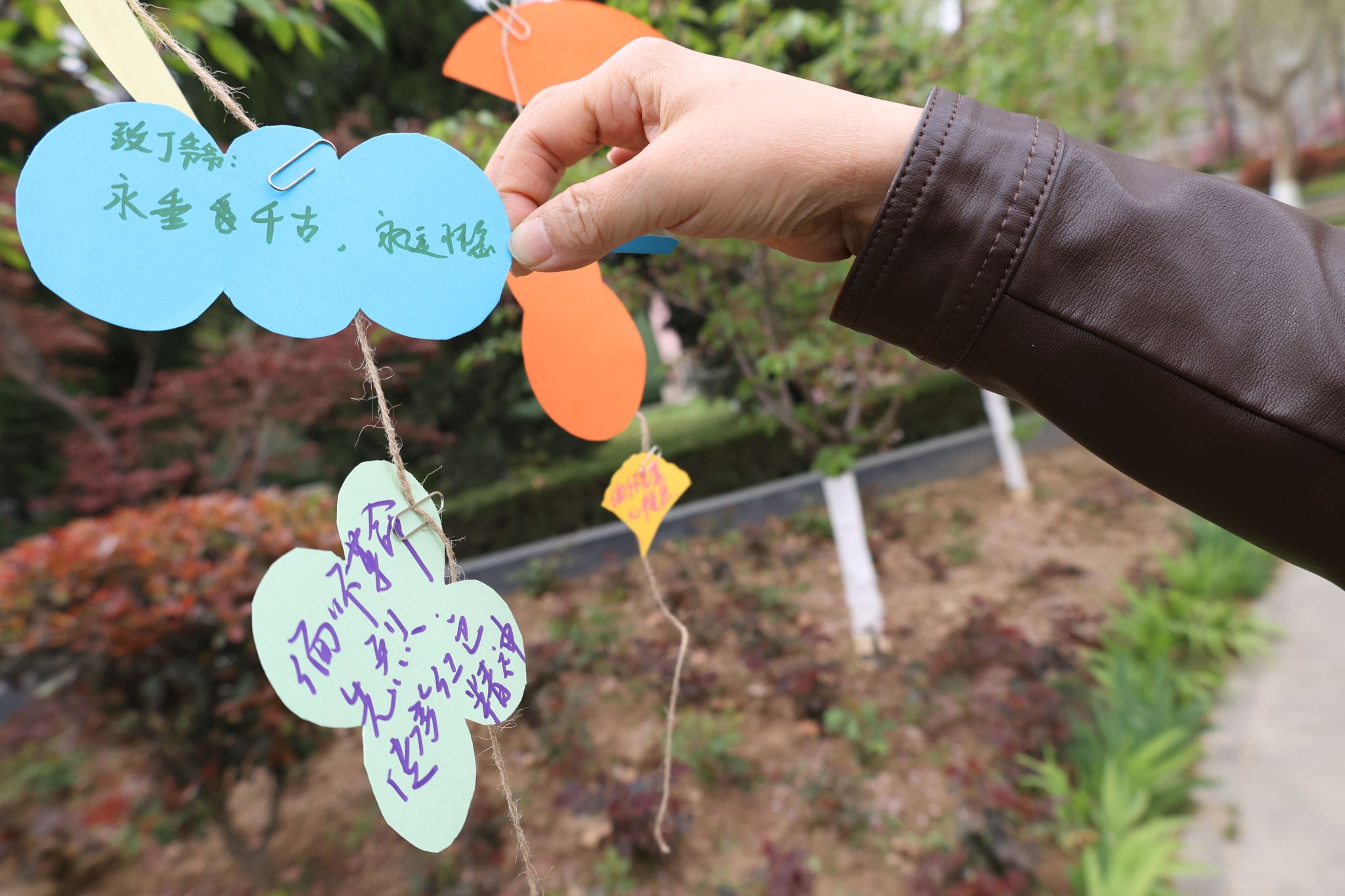 随后,全体师生共同将写满心意的寄语卡别挂于树上,一张张卡片随绳错落垂悬,在春风中轻扬,成为广场上一道温情又庄重的风景。这串串寄情的卡片,既是对先烈先辈的深情告慰,更是对丁祖诒老院长的深切怀念,也承载着学子们许下自律成长、笃行不怠的郑重承诺。寄语卡悬挂完成后,全场肃立,进行静默缅怀仪式,无声的思念在春风里静静流淌,每一位参与者都以最虔诚的姿态,致敬先烈先辈、追思丁祖诒老院长,切实践行文明清明的理念。